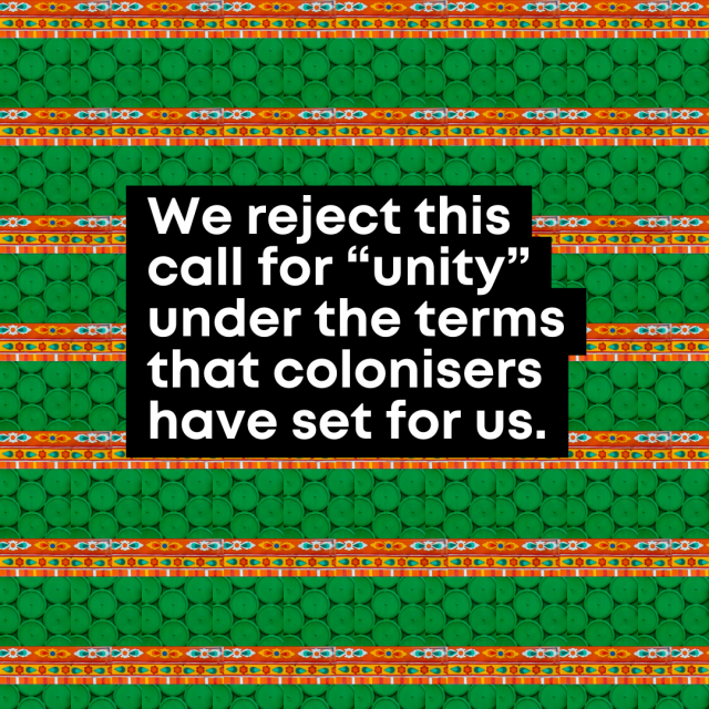 We reject this call for “unity” under the terms that colonisers have set for us. We instead envision a solidarity amongst colonised Global South communities, that looks towards healing and liberation. We will never be free under coloniser frameworks or institutions, and so we must cultivate our own.