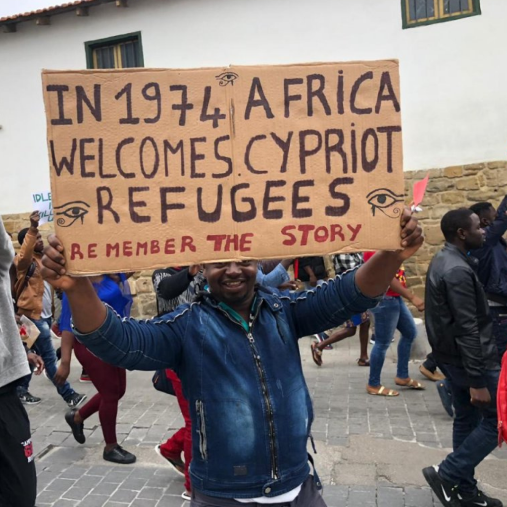 Protester campaigning for justice for asylum seekers in Cyprus, calling for solidarity through drawing attention to the fact that Cypriot refugees were welcomed in Africa in 1974. The Cypriot conflict was brought about by British divide and rule, culminating in a Greek coup and Turkish invasion.