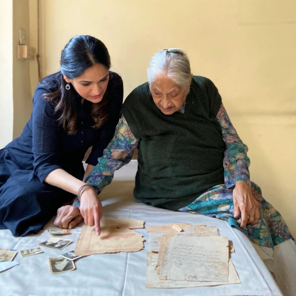 Aanchal with her grandmother Bhag Malhotraand look over old Partition documents. Bhag was made into a refugee after India was partitioned, and had to flee to Delhi. This echoes the stories of many who were displaced during the Partition. British divide and rule fomented conflict between Hindus and Muslims, and precipitated the Partition.