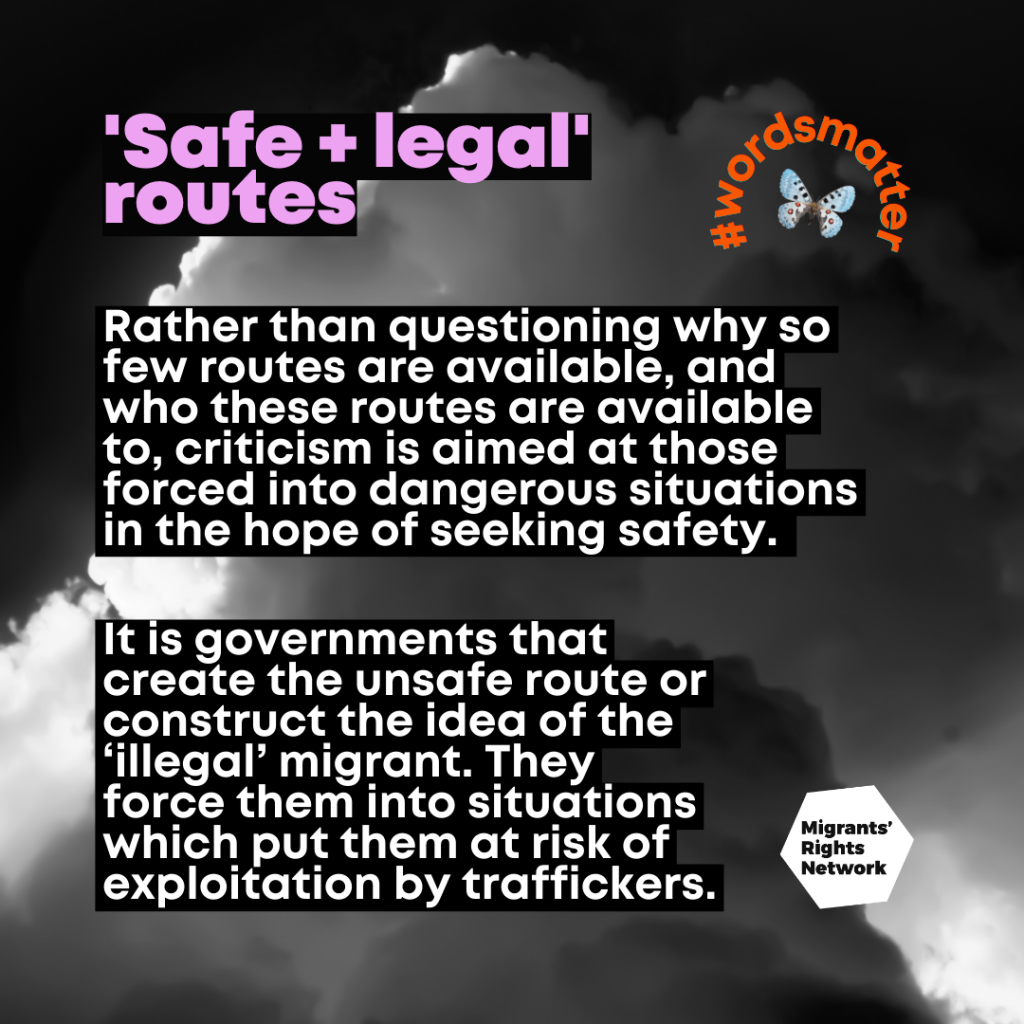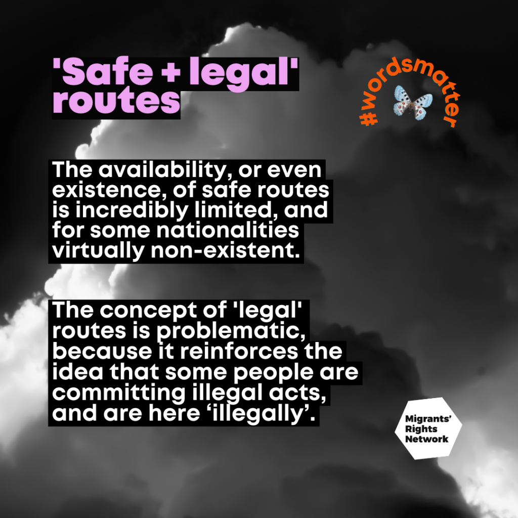 The idea of “legal routes” is often pushed by advocates and opponents of migration, however we believe this concept is problematic. The “legal route” narrative means that any other route by which someone may arrive in the UK without permission is ultimately “illegal” by default. The idea of “legal routes” reinforces the idea that some people are committing illegal acts, and are here “illegally”.